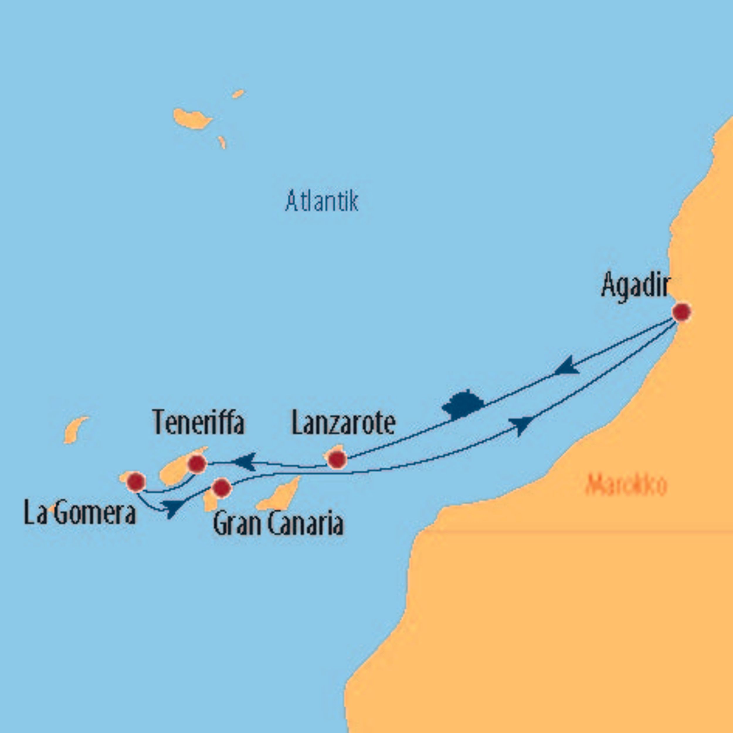 Kommen Sie an Bord der neuen Mein Schiff 7 und erleben Sie eine wundervolle Reise durch die fantastische Inselwelt der Kanaren. Doch nicht nur die abwechslungsreiche Landschaft macht diese Reise zu etwas ganz Besonderem, auch zahlreiche Inklusivleistungen sorgen für einen unbeschwerten Urlaub. Entspannen Sie mit einem Cappuccino auf dem Sonnendeck, stoßen Sie gemeinsam mit einem Frischgezapften an, genießen Sie einen der zahlreichen Cocktails in einer der gemütlichen Bars, oder nehmen Sie einen kleinen Aperitif mit Blick auf´s Meer – alles schon im Reisepreis enthalten. Lanzarote, Teneriffa und La Gomera erwarten Ihren Besuch. Obwohl zu einer geografischen Gruppe gehörend, besitzt jede der kanarischen Inseln seine eigene unverwechselbare Landschaft. Während eines Abstechers nach Agadir können Sie in die orientalische Lebensweise eintauchen.