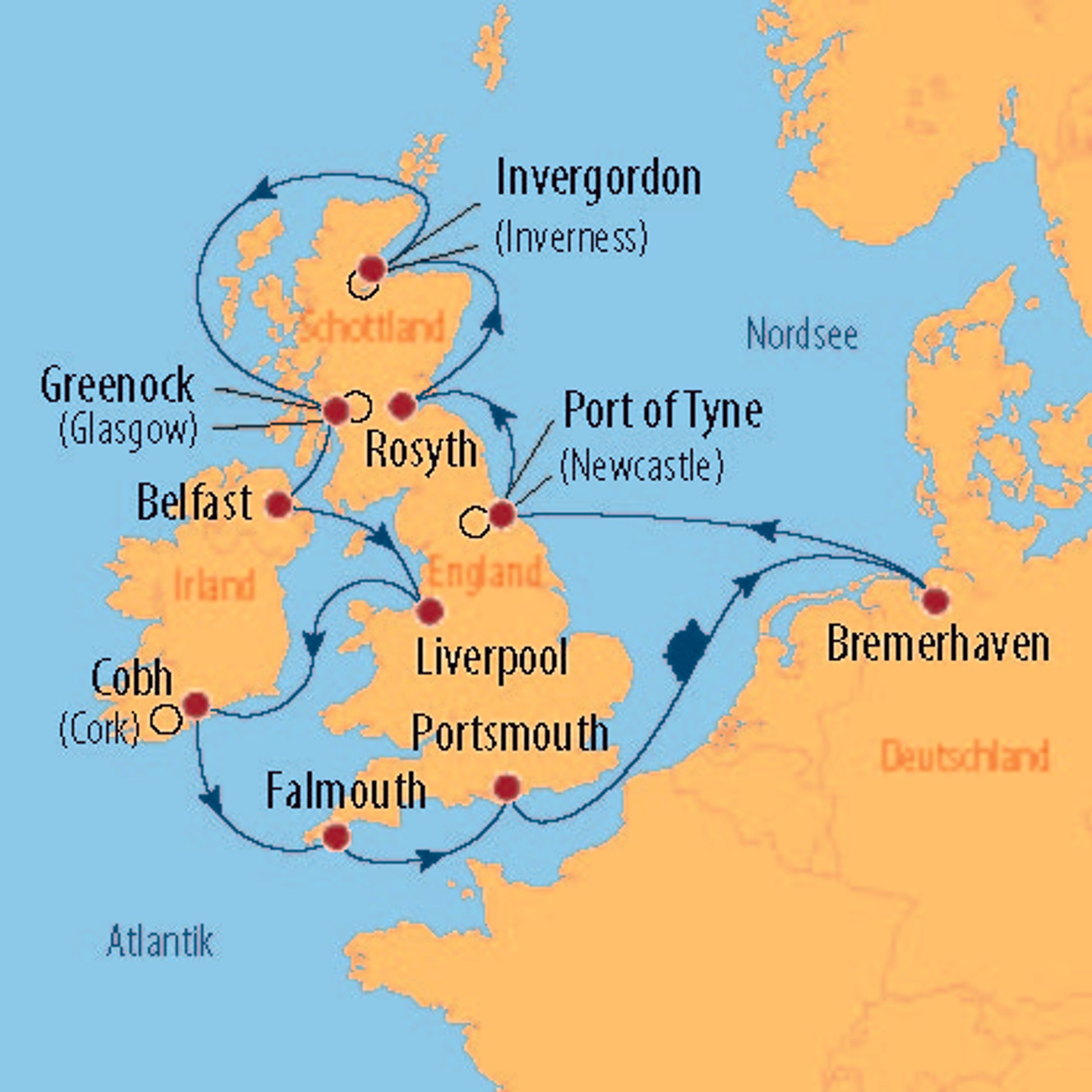 Very British ist diese 14-tägige Kreuzfahrt mit MS Artania rund um die Britischen Inseln. Freuen Sie sich auf die maritime Küstenvielfalt und entdecken Sie die kulturellen, historischen und landschaftlichen Unterschiede und Gemeinsamkeiten von England, Irland und Schottland. Bei zahlreichen Ausflugsangeboten tauchen Sie in das typisch britische Leben ein und erfreuen sich an den weitläufigen Landschaften, imposanten Burgen und prunkvollen Schlössern. Interessante Städte, wie Edinburgh, Belfast und Liverpool wechseln sich bei dieser Reise mit traumhaft schönen Naturregionen, wie den schottischen Highlands, ab. Bei den zahlreichen Ausflugsangeboten finden sich weitere Höhepunkte: von der typischen Whiskeyverkostung, dem Titanic-Museum in Belfast. bis zum sagenumwobenen Loch Ness oder Stonehenge – für jeden ist garantiert das Passende dabei.