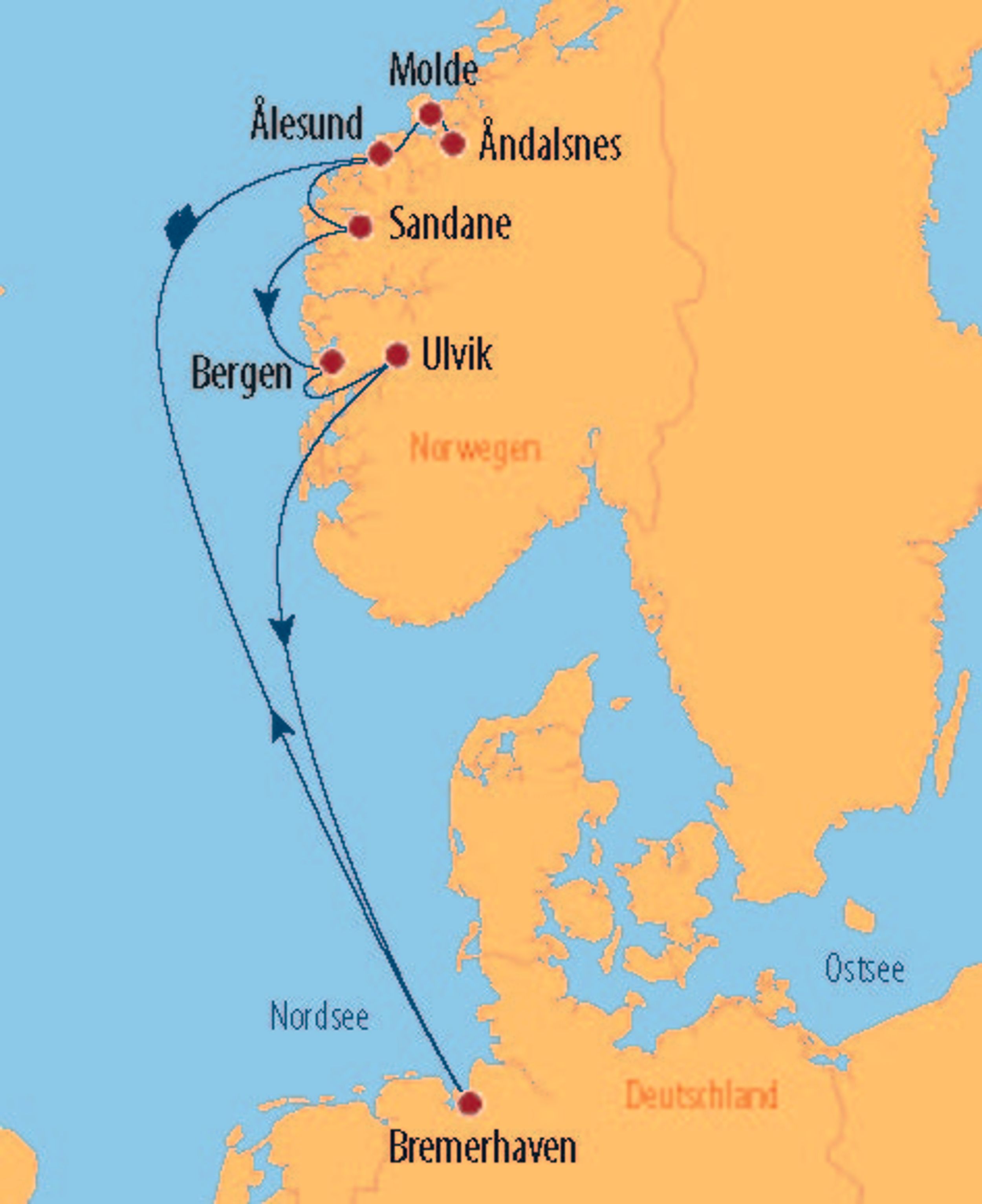 Auf dieser Kreuzfahrt erkunden Sie die faszinierenden Fjorde Norwegens, lernen tolle Städte kennen und genießen atemberaubende Ausblicke auf eine faszinierende Landschaft. Bummeln Sie durch das Jugendstilzentrum Ålesunds und durch Molde - die „Stadt der Rosen“. Über Sandane erreichen Sie Bergen. Farbenprächtige Holzhäuser heißen Sie willkommen und berichten von der Blütezeit des mächtigen Hansebundes. Spektakuläre Fjord- und Berglandschaften mit Gletschern erwarten Sie am Hardingerfjord. Auf Grund des milden Klimas durch den Golfstrom werden hier zahlreiche Obstsorten angebaut. Viel zu schnell erreichen Sie wieder Bremerhaven und Sie werden mit zahlreichen tollen Erinnerungen von Bord gehen.